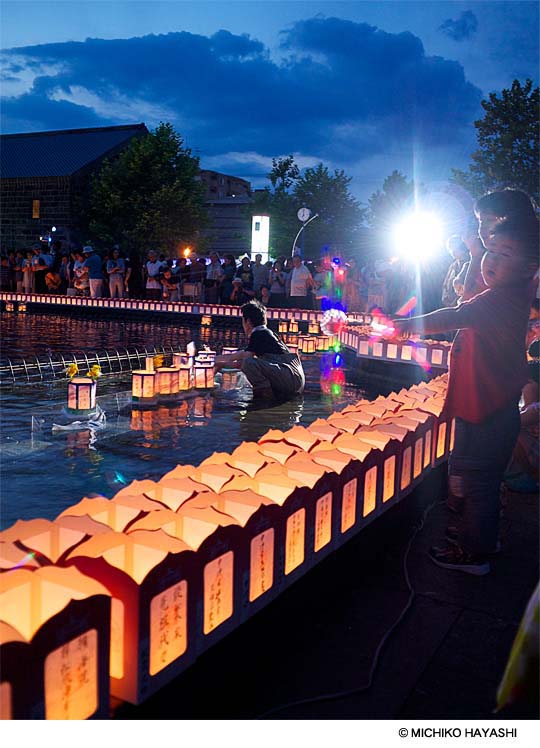 昨夏のお盆休みがあけたころ、森山大道さんの写真展「北海道—第2章/展開」を観に、小樽から札幌へ、一人旅をしました。小樽の北運河に近い小さな宿に泊まり、 ちょうどその晩「おぼん万灯会」が行われると知り、 そこからほどなくの小樽運河公園まで、夕食前の散歩がてら、ふらりと歩いていきました。