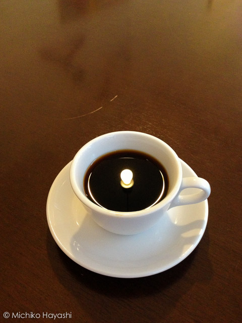 運よく、たまたま2階は先客がなくガランとしていて…空間を独り占め!! 初めてのスペースをあれこれ興味深く眺めているうちに、運ばれてきた珈琲の面に電球の灯りが映っていることに ふと 気がついて。